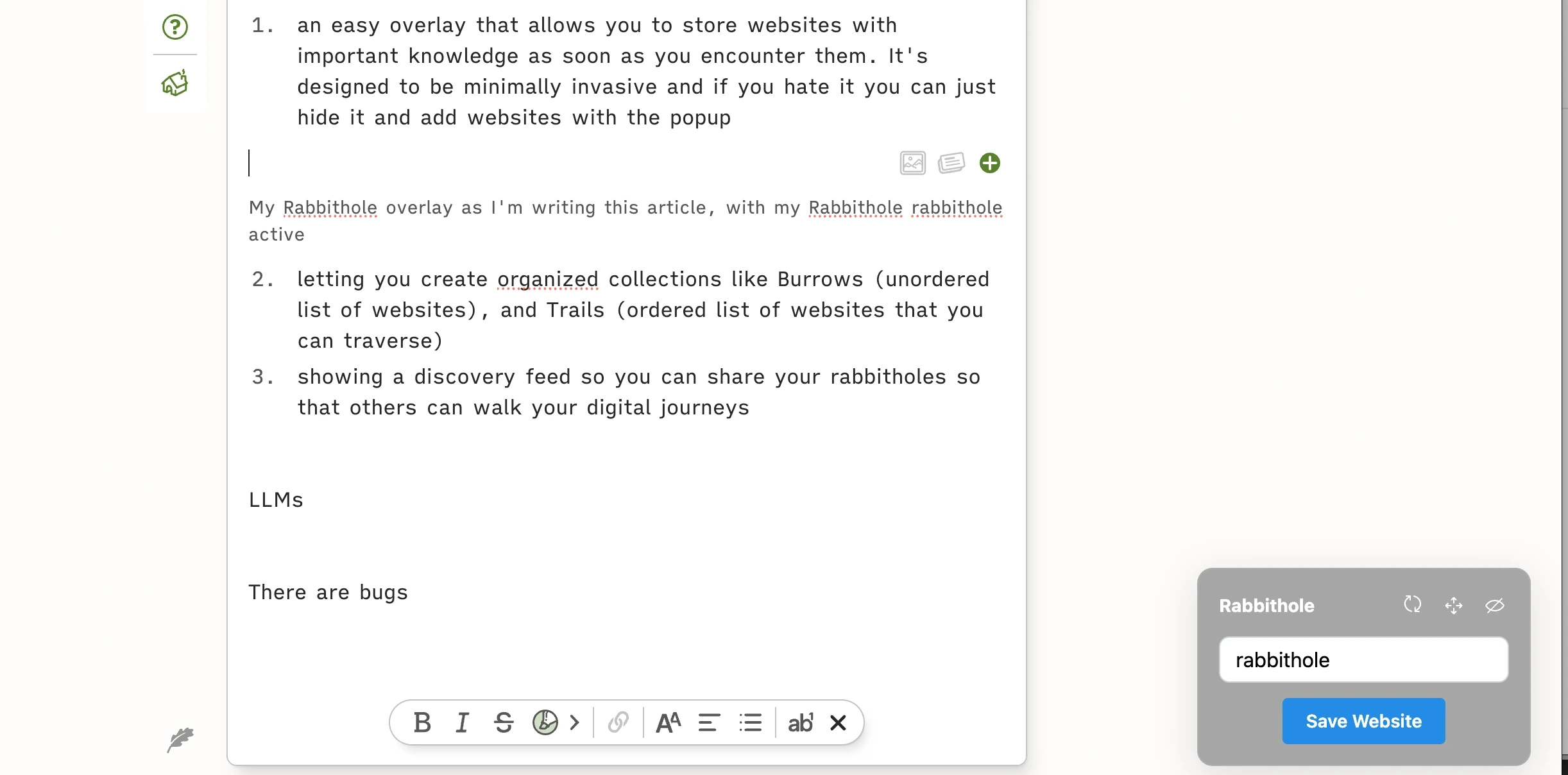 an easy overlay that allows you to store websites with important knowledge as soon as you encounter them. It's designed to be minimally invasive, and if you hate it you can just hide it and add websites with the popup. You can use it to add to an existing rabbithole or create a new one on the fly
