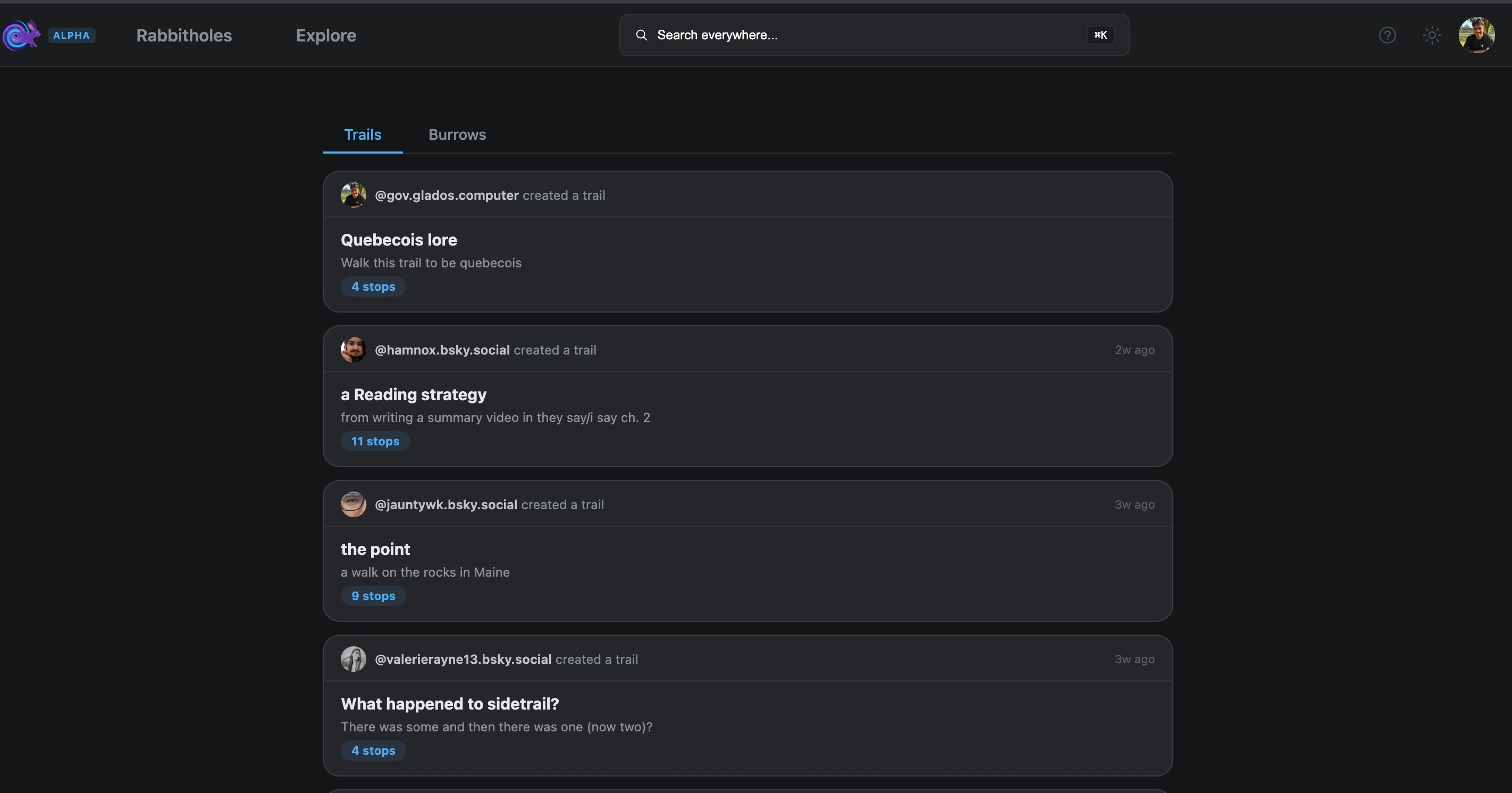 Everything you create is stored on your browser's IndexedDB. Obviously your web search history is extremely private and nothing leaves your device, unless you publish it. When you do publish burrows or trails, you choose exactly what you share to the Atmosphere. I really want to be able to sync across devices but we gotta wait for all this cool stuff to become real.