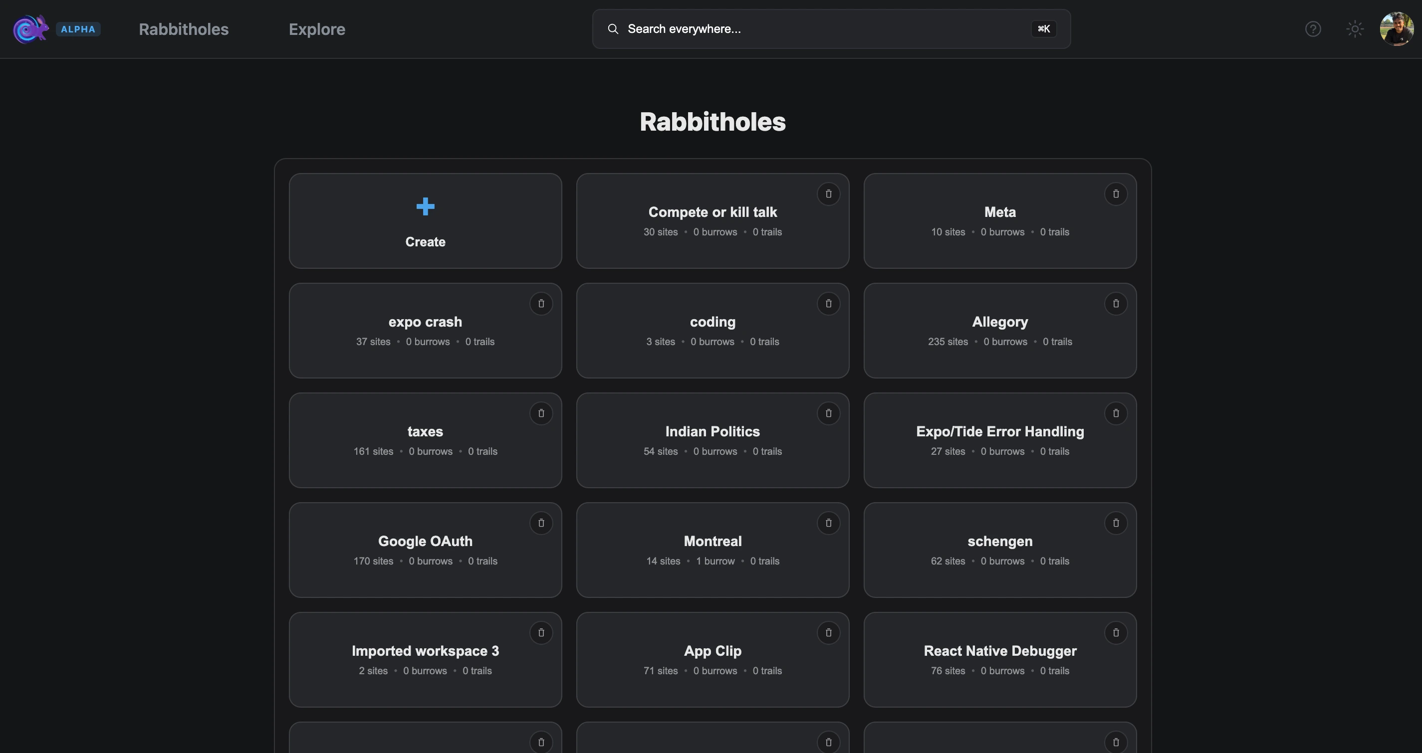 a Rabbithole view, which are basically Pinterest boards but for websites. You can grab websites in the wild that matches a category and put them in there. I commandeered the new tab page for this as I haven't found a single person (on a major browser) that cares about it.